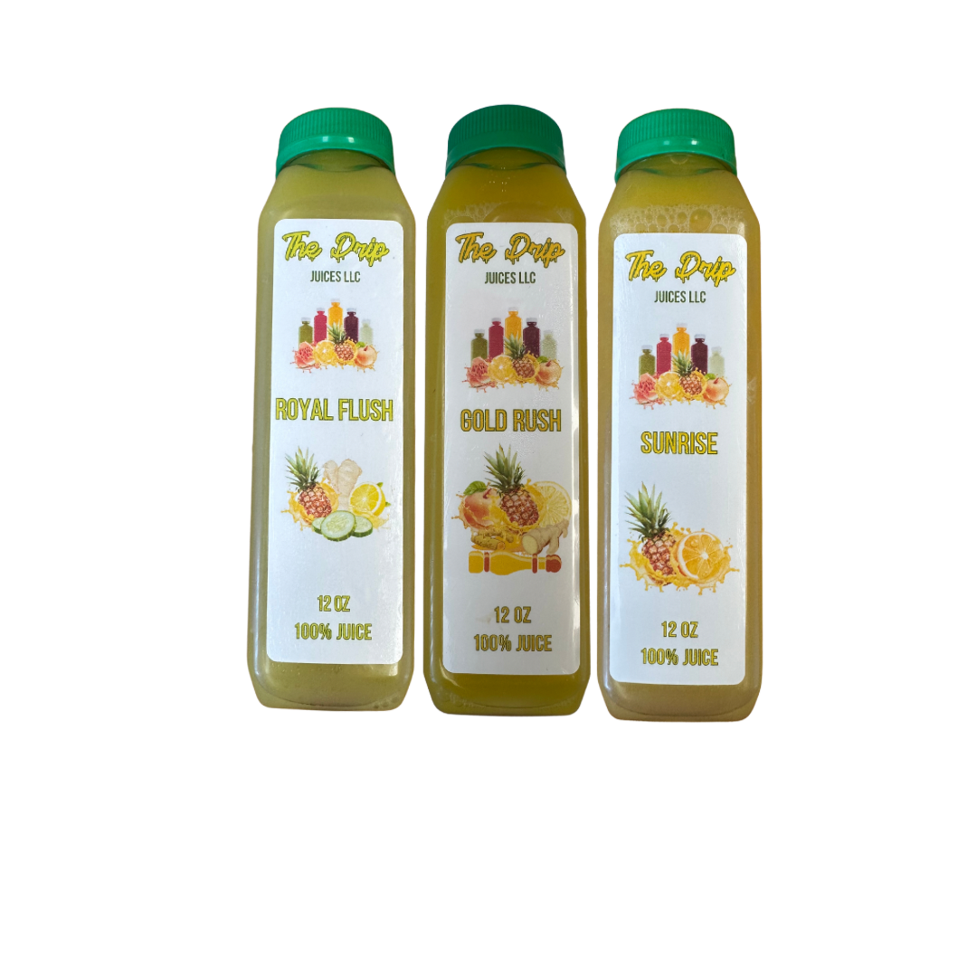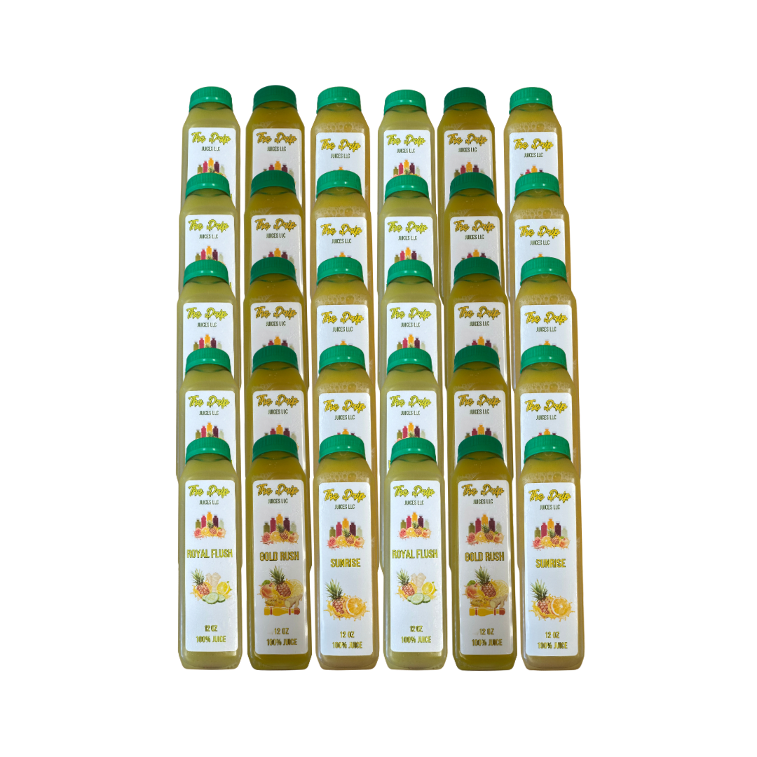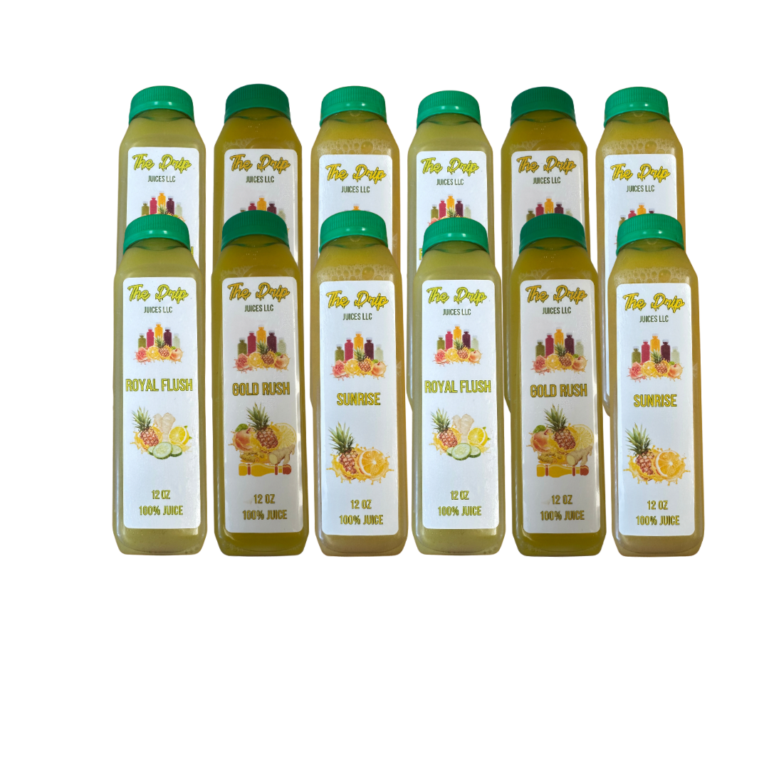 The Fruit Cleanse comes with 3 of our Juice Flavors, Gold Rush, Royal Flush and Sunrise. You'll be consuming an abundance of different nutrients that will fuel you while at the same time help cleanse and regenerate your body.