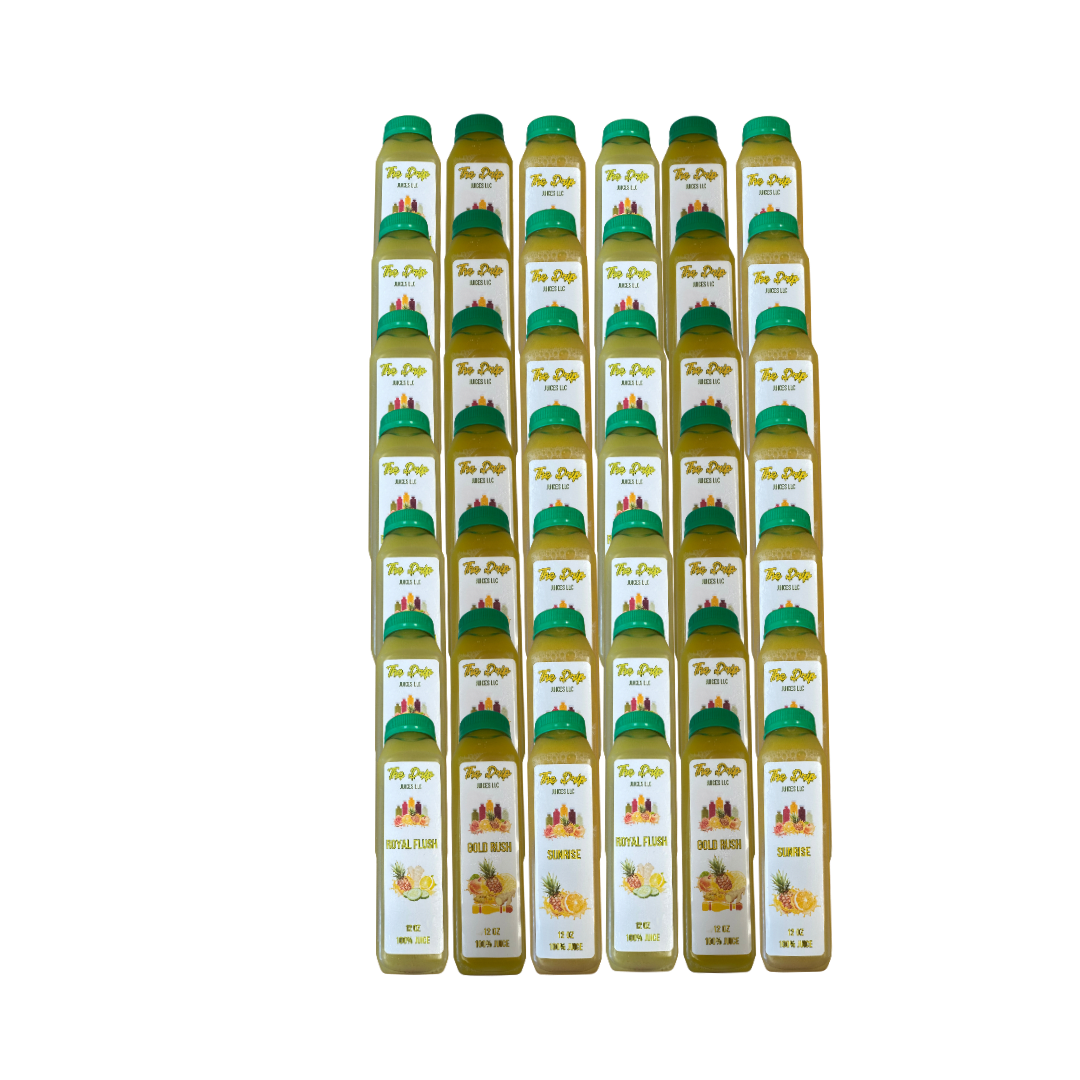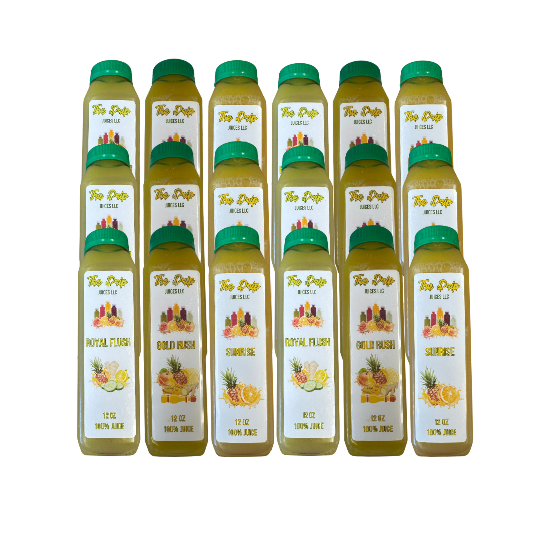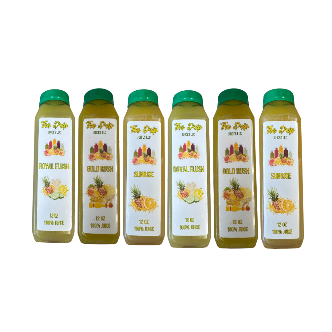 The Fruit Cleanse comes with 3 of our Juice Flavors, Gold Rush, Royal Flush and Sunrise. You'll be consuming an abundance of different nutrients that will fuel you while at the same time help cleanse and regenerate your body.